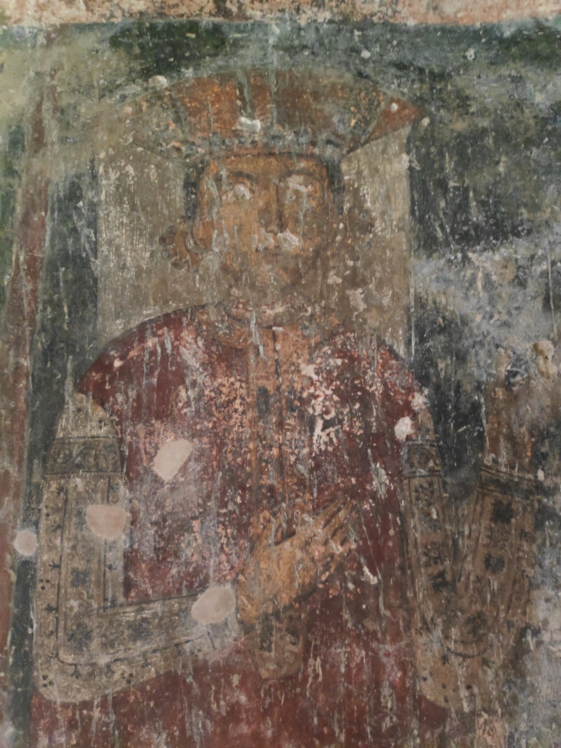 Промушвайки се през малкия вход, попадам в тесен и мрачен притвор, където, както е обичайно за църквите от този период, са изографисани портрети на ктиторите. За щастие научно-техническият прогрес на 20-ти век е достигнал дори в тази застинала в далечното минало църква поне с едничко свое проявление – има електрическо осветление. Така че мога на спокойствие да разгледам стенописите вътре.