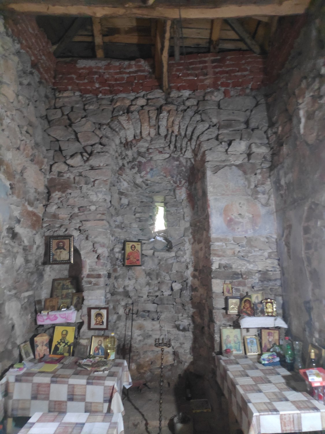 В самия наос положението със стенописите е дори по-лошо. Мъничкото прозорче не е достатъчно да разсее гъстия мрак вътре и ако не е електрическата лампа, съвсем нищо няма да се види. Мирише на стара селска плевня – една миризма, която бях позабравил. Тук са светиите, но кои са те вече никой не може да каже. От тях е останало твърде малко.
